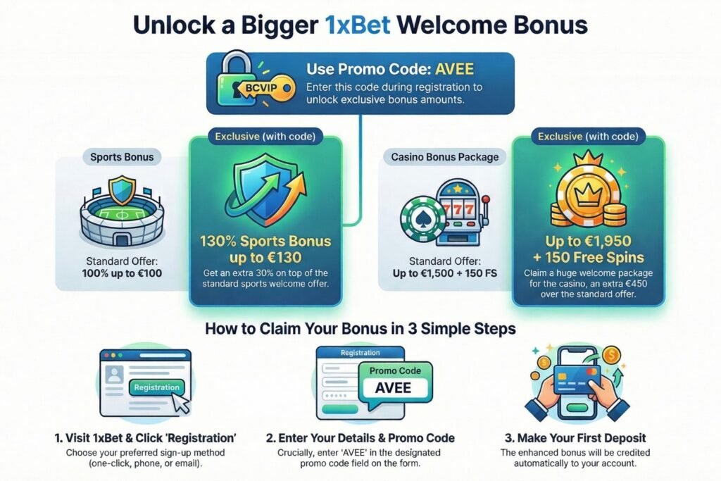 1XBET Promo Code 2026: AVEE | Claim Your Exclusive €130/$145 Sports Bonus & €1950 Casino Package